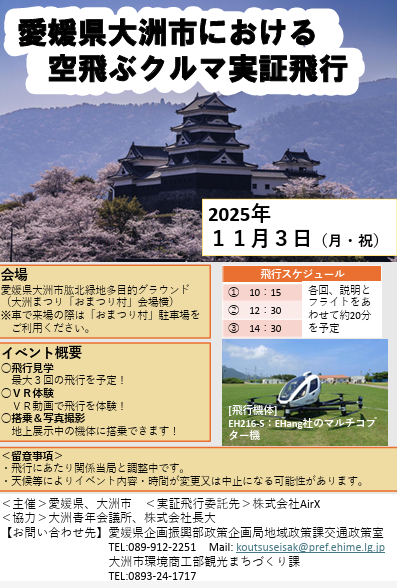 愛媛県では空飛ぶクルマの実装に向け、機運醸成や社会受容性の向上に取り組んでいます。そして愛媛県・大洲市が手を挙げて空飛ぶクルマの実証飛行を実施します。飛行見学以外にも、機体展示や地上での搭乗体験、VR体験も実施予定です。