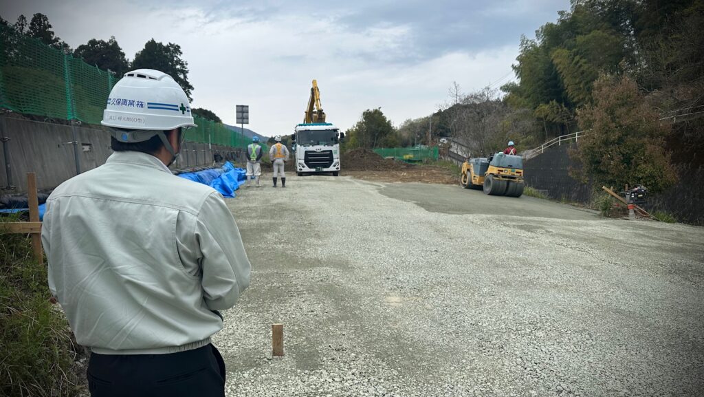 ここは自動車専用道路の隣で工事をしている現場です。どのような危険が考えられますか?例えば重機と大型ダンプや人の接触や、路肩からの転落などでしょうか。重機だと旋回する方向も気になりますよね。皆さんはいかがでしょうか。書き手の私は、弊社から大型ダンプが土砂運搬でこの現場に入っているため一番気になることは、大型ダンプが起因となる事故です。後進、停止、飛散防止、接触防止などの様子を確認しました。運転手さんとも会話して、しっかりとガードマンさんの誘導に沿って後進もできていたので安心。