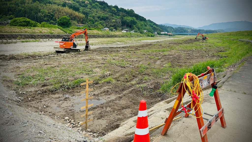 さて、今回の現場は会社近くの河床掘削工事の現場をパトロールしました。河床掘削とは簡単に言うと、川の底にたまった砂や石を、機械で掘って、川を深くすること。これを行うことで大雨が降った際の氾濫を防ぐことができるとても重要な工事です。現場ではまだ土砂運搬は行われておらず、準備段階として草刈り、ゴミ拾い、根と土のふるい分けなどを行っていました。この準備がとても大切で、しっかりとこれらの工程を踏むことでどれくらいの土砂が堆積しているのかが把握できます。この工程を終えてドローンで空撮して搬出前の土量を計算します。