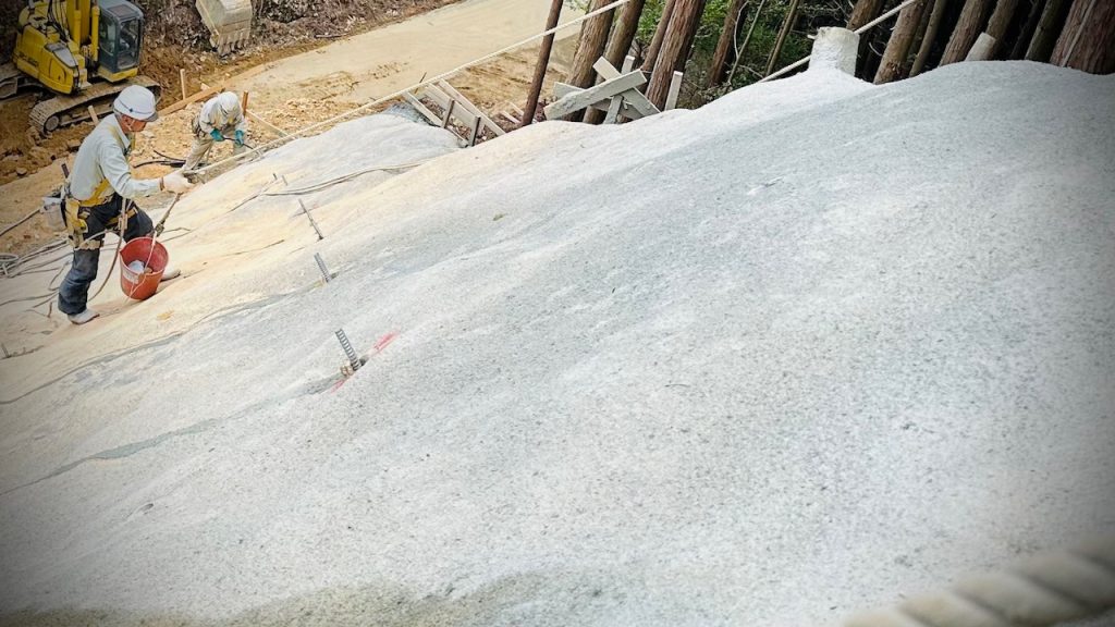 次の現場は土砂崩れで塞がれてしまった道を復旧させる工事現場です。弊社は工事範囲の中で吹付工事を担当しています。吹付工事とは、山やガケが崩れないように、コンクリートで斜面を固める工事です。これを怠るとまた山が崩れて道をふさいでしまうかもしれません。山を整形する工事と共に大変重要な工事です。安全帯と親綱を連結させ、斜面を強化していく工事なので、手元で作業する作業従事者と、機械操作の作業従事者に分かれます。どのように連携を図っているのかと問うと、しっかりと簡易トランシーバーを使用して意思疎通をしていました。